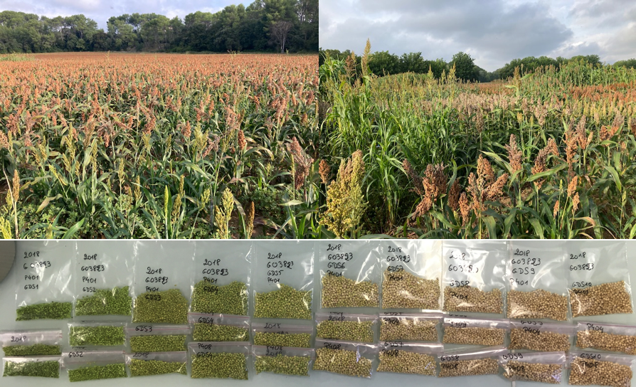 Fig. 2: Top left: cultivated sorghum field. Top right, sorghum panicle diversity. Bottom, kinetics of development and maturation of sorghum grains (photos C. Périn, Nancy Terrier).