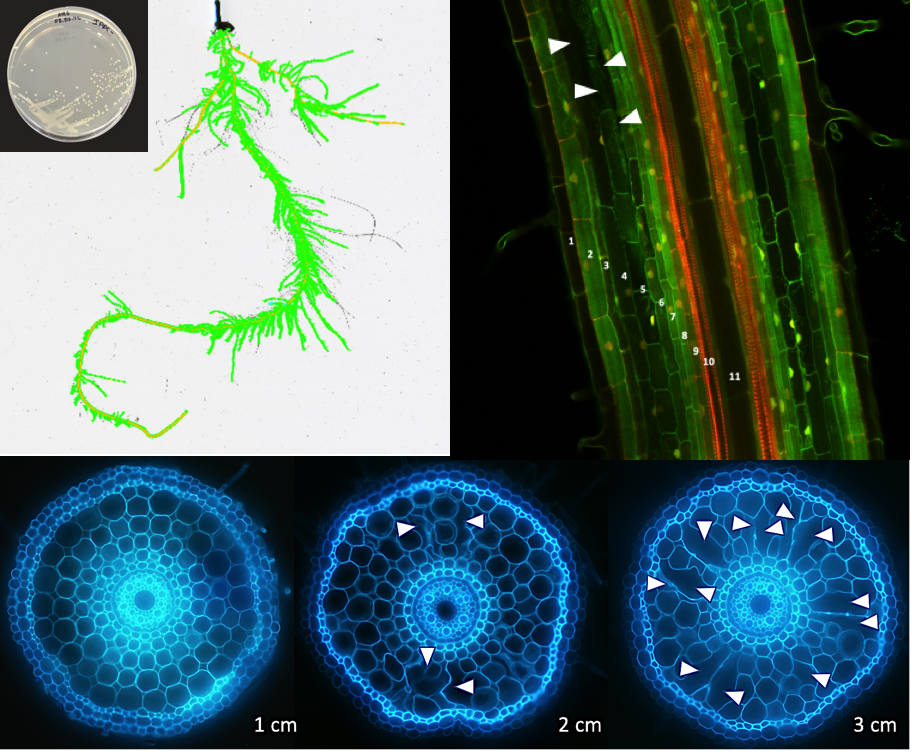 Fig. 1: From left to right and top to bottom. Architecture analysis of a rice root system using SMARTROOT after inoculation with azospiriullum brasilense sp245 ipdc- (insert). The coronary roots stand out in yellow and the lateral roots in green (photos Joanye Canguio). Median multiphoton view of a rice root p35 :YFP counterstained with propidium iodide at the aerenchyma formation zone and treated with ClearSee (photo Christophe Périn). Aerenchyma formation (white arrowheads) in the rice seminal root at 1, 2 and 3 cm from the root tip (photos Sergi Navarro). White arrows: formation of aerenchyma by cell death and detachment of the cortex walls.